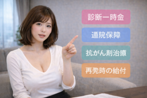 診断一時金、通院保障、抗がん剤治療への対応、再発時の給付条件等、